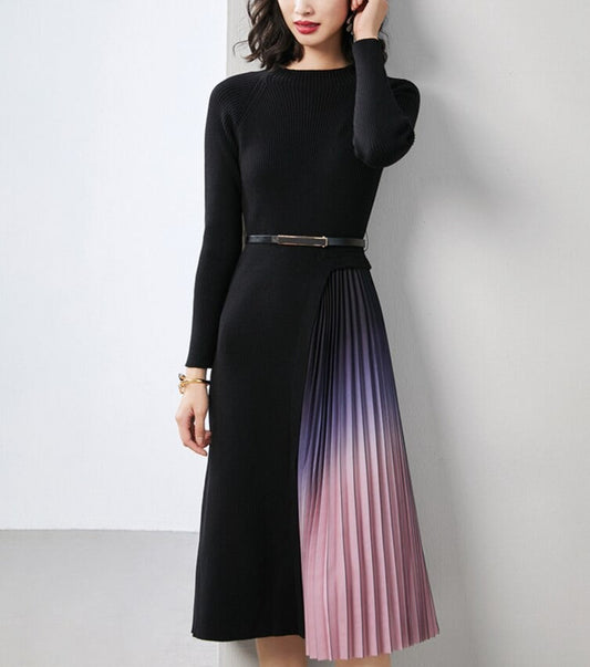 Vestido Gótico Gradient Pleated Splicing Belted Knit